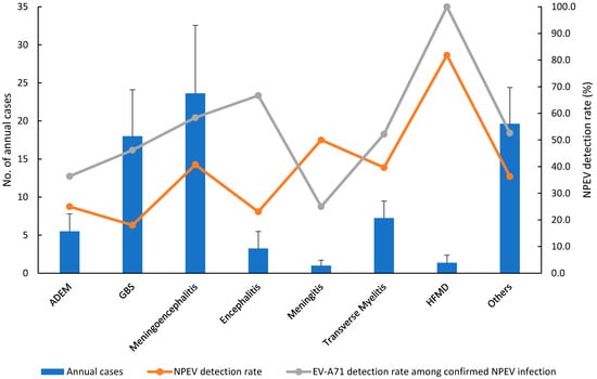 The bar graph shows the monthly number of AFP patient cases, and the line graph displays the NPEV detection rate in the AFP surveillance system, 2012–2019. The diagnoses of patients with AFP were diverse, including meningoencephalitis reported in 189 cases (29.7%), followed by Guillain-Barré syndrome (GBS) in 144 cases (22.6%), transverse myelitis in 58 cases (9.1%), acute disseminated encephalomyelitis (ADEM) in 44 cases (6.9%), encephalitis in 26 cases (4.1%), hand-foot-mouth diseases (HFMD) in 11 cases (1.7%), meningitis in 8 cases (1.3%), poliomyelitis in 6 cases (0.9%), and other clinical syndromes, including myositis, hypokalemic paralysis, infection, and undefined paralysis in 151 cases (23.7%) (Figure 2). Except for the patient group with GBS, ADEM, and encephalitis, >30% of NPEV detection rates were identified in most of the patient groups (Figure 2). Higher EV-A71 detection rates of >50% occurred in HFMD (100%), encephalitis (66.7%), meningoencephalitis (58.4%), transverse myelitis (52.2%), and others (52.6%) (Figure 2).