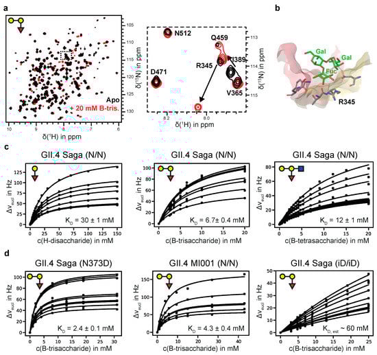 (a) 1H,15N TROSY HSQC spectra of [U-2H,15N]-labeled GII.4 Saga P-dimers in the absence and presence of B-trisaccharide 3. The insert is highlighting CSPs due to binding of 3. (b) HBGA binding pocket of GII.4 Saga P-dimers (pdb 4 × 06) highlighting the close proximity between the L-fucose residue and R345 causing the strong CSP shown in (a). (c) CSP titration curves for H-disaccharide 1, B-trisaccharide 3, and B-tetrasaccharide 4 (from left to right). (d) CSP titration curves for B-trisaccharide 3 binding to the N373D mutant of GII.4 Saga P-dimers, to MI001 P-dimers, and to fully deamidated GII.4 Saga P-dimers (from left to right).