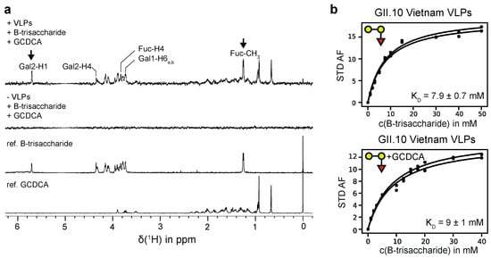 (a) STD NMR experiments for a sample of GII.10 Vietnam 026 VLPs (0.87 mg/mL) and 2 mM B-trisaccharide 3 in the absence and presence of saturating amounts of GCDCA (1 mM). For water suppression an excitation sculpting sequence [54] was used. The signals of the anomeric protons of β-D-galactose (Gal1) and α-L-fucose (Fuc) are hidden by the water signal (suppressed). The arrows denote the signals of the anomeric proton of the α-D-galactose residue (Gal2) and of the C6-methyl group of the α-L-fucose residue (Fuc) of 3. The STD intensities of these signals were used for the determination of dissociation constants from STD NMR titration experiments. (b) Binding isotherms for H1 of Gal2 and the C6-methyl group of Fuc of 3 in the absence (left) and in the presence of GCDCA (right). Samples contained 0.95 mg/mL or 0.87 mg/mL GII.4 Vietnam 026 VLPs according to the absence or presence of GCDCA, respectively. All samples were prepared in PBS buffer (8% D2O) at a pH* of 7.20. NMR experiments were acquired at 600 MHz at a temperature of 277 K.
