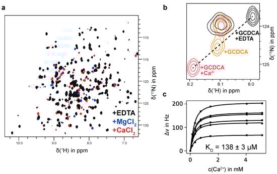(a) 1H,15N TROSY HSQC spectra of 150 μM [U-2H,15N]-labeled CW1 P-domain saturated with GCDCA (black contours) and in the presence of 5 mM MgCl2 (blue contours) or CaCl2 (red contours). No assignment is available yet, but the same set of signals is affected by both Mg2+ and Ca2+ indicating a shared binding pocket. (b) Effects of adding EDTA or Ca2+ to the P-domain in the presence of saturating amounts of GCDCA. Black contours correspond to the respective spectrum in (a). Addition of EDTA (black) shifts the resonance signal in the opposite direction as addition of Ca2+ (red) showing that GCDCA contains a significant amount of calcium ions. Therefore, all P-domain samples having GCDCA added also contain an undefined amount of Ca2+. (c) Euclidean CSPs can be calculated from a Ca2+ titration series with the chemical shifts of an EDTA-treated sample taken as starting points. Due to the Ca2+ contamination the total Ca2+ concentration during the titration is not known precisely. Using the amount of added Ca2+ ions, a global least-squares minimization of CSPs larger than two standard deviations were used to derive both, the initial Ca2+ concentration and the dissociation constant KD. This approach yields a KD value of 138 μM. With 300 μM GCDCA, the initial Ca2+ contamination was determined as 140 μM. Spectra were acquired in 20 mM sodium acetate, 100 mM NaCl (pH 5.3). Ca2+ was titrated to a sample containing 250 μM P-domain.