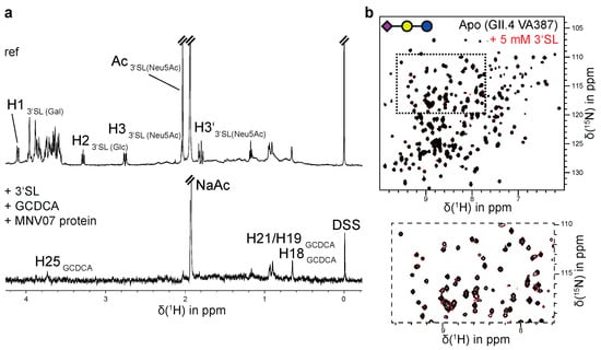 MNV and GII.4 P-domains do not bind to sialic acid containing glycans. (a) STD NMR spectra of MNV07 P-domains in the presence of the ligand GCDCA and 3′-sialyllactose (3′SL). There is no saturation transfer to protons of 3′SL. Only GCDCA signals show STD effects. The sample contained 80 µM protein in 20 mM sodium acetate buffer (pH 5.3), 250 µM GCDCA, and 2 mM 3′SL. Spectra were acquired at 298 K at 600 MHz. (b) 1H,15N TROSY HSQC spectra of 170 µM [U-2H,15N]-labeled HuNoV GII.4 VA387 P-dimers with and without 3′SL showing no binding of 3′SL. A representative section of the spectra highlights the absence of CSPs upon 3′SL addition. The sample was prepared in 75 mM sodium phosphate buffer, 100 mM NaCl (pH 7.3).
