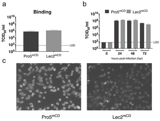 In order to determine the effect of MNV-1 infection, susceptible cell lines lacking sialic acid on their cell surface were infected with MNV-1 (Figure 5). For this, a parental CHO derived cell line (Pro5) and a recombinant Pro5 mutant (Lec2), deficient in transporting CMP-sialic acid into the Golgi compartment [48], were transduced to stably express the MNV-1 entry receptor mCD300LF. The parental Pro5 mCD300LF and recombinant Lec2 mCD300LF cells support MNV infection similarly to naturally susceptible murine monocyte derived cell lines. The absence of sialic acid from the cell surface of Lec2mCD300LF cells as described previously [48] was monitored by FITC-conjugated wheat-germ agglutinin staining. Binding was determined inoculating Pro5mCD and Lec2mCD with MNV-1 with an MOI of 5 for 1 h on ice removing the inoculum and determining the TCID50 of virions bound the cells. Infection was determined by inoculating respective cells with MNV-1 with an MOI of 0.05 for 1 h on ice removing the inoculum and determining infection between 0 and 72 h post infection by end-point dilution. No significant differences were observed at any analyzed timepoint, suggesting that cell surface sialic acids do not contribute to MNV-1 infection in this system.