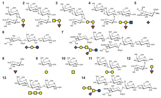Oligosaccharides used in this study. 1 and 12: blood group H-disaccharide; 2: blood group A trisaccharide; 3: blood group B trisaccharide (azido group at the anomeric position); 4: blood group B tetrasaccharide (reducing form); 5: methyl glycoside of N-acetyl α-D-neuraminic acid (sialic acid); 6: 3′-sialyllactose (3′SL, glycan part of GM3 ganglioside); 7: glycan part of GD1a ganglioside; 8: methyl α-L-fucopyranoside; 9: D-galactose; 10: N-acetyl D-galactosamine; 11: Galili epitope; 13: Forssman antigen; 14: glycan part of GM1a ganglioside.
