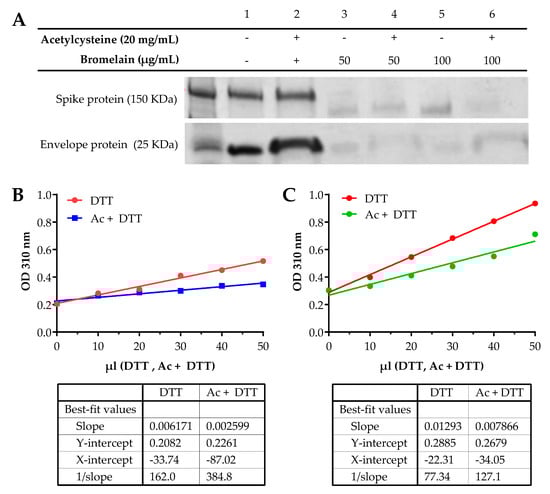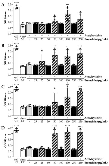 3.3. In Vitro SARS-CoV-2 Inactivating Potential of Bromelain, Acetylcysteine, and BromAc