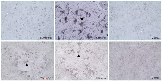 Cytopathic effect (arrowheads) in inoculated chicken embryo fibroblast with P/Aus/3/11, Komorov and CEF control with (bottom three) and without (top three) the addition of carboxymethyl-cellulose in the absence of trypsin (10×).