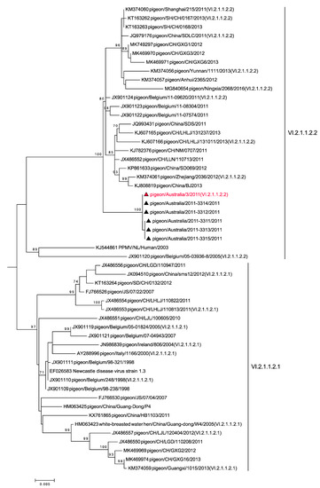 Virus isolation from oropharyngeal and cloacal swabs was conducted by inoculation of 9-day-old SPF ECEs via the allantoic cavity. Allantoic fluid that tested positive for haemagglutination was further tested by HI, as described below. Harvested allantoic fluid was aliquoted and stored at −80 °C for subsequent characterisation and use in for chicken challenge trials. The infectious titre of the virus stock was determined by titration in embryonated chicken eggs and the 50% egg infectious dose (EID50)/mL was calculated according to the method of Reed and Muench [18]. The prototype viral isolate was obtained from a pigeon cloacal swab and was designated APMV-1/pigeon/Australia/3/2011 (herein referred to as P/Aus/3/11). Chicken antiserum to this isolate was subsequently prepared in SPF chickens at ACDP.