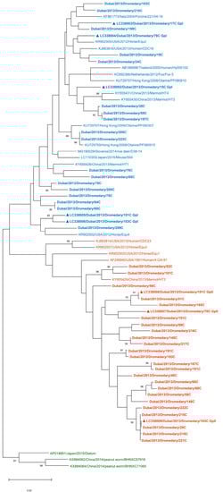 In this study, we presented a comprehensive analysis on the molecular epidemiology and genomics of PBVs in dromedaries. In our previous metagenomic study on pooled dromedary fecal samples, we observed an exceptionally higher number of PBV compared to other viral sequences []. In the present study, we used two pairs of primers based on conserved regions of the RdRp gene to detect genogroup I and genogroup II PBVs separately in 229 dromedary fecal samples from Dubai. It was observed that genogroup I and genogroup II PBVs were present in 41% and 22% of the samples, respectively, while both genogroup I and II PBVs were present in 10% of the samples. In the literature, the prevalence of genogroup I PBVs in the fecal samples from a wide range of animal species, such as roe deer, pigs, rats, sheep, cattle, chickens, and mongooses, have been studied [,,]. The highest prevalence was in roe deer (62%) and monkeys (48%) [,]. However, comprehensive studies on genogroup II PBVs are relatively few compared to genogroup I PBVs and the reported prevalence of genogroup II PBVs in fecal samples of pigs, cattle, and sheep were all <10% [,,,]. The present study is the first one that described such an unprecedentedly high prevalence of 22% for genogroup II PBVs in animals. We speculate that the relatively higher prevalence of genogroup II PBVs in the present study, as compared to those described in the literature, may be due to the screening primers that we used. This highly sensitive primer set will be used for molecular epidemiology studies of other animals to see if a higher prevalence of genogroup II PBV will also be observed.