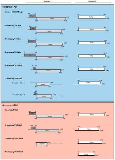 Schematic representation of the gene arrangement of segment 1 and segment 2 of genogroup I (blue box) and II (red box) PBVs sequenced from dromedary fecal samples. Reference sequences are displayed at the top of the corresponding box. The segment 1 sequences in this study encode a capsid protein (light grey box) and an upstream ORF, which encodes a hypothetical protein with unknown function (hyp; dark grey box). The segment 2 sequences encode an RNA-dependent RNA polymerase (RdRp; white box). Stars indicate the presence of conserved bases in the 5′ and/or 3′ UTRs. Partial sequences have dashed lines at the end, indicating the absence of a stop codon. Numbers indicate the position and lengths of the ORFs.