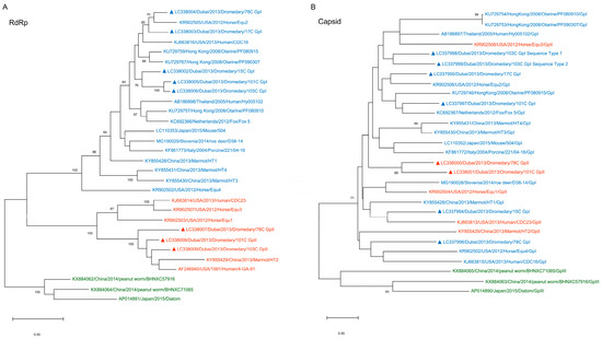 3.4. Phylogenetic Analysis of Capsid and RdRp Sequences of Dromedary PBVs