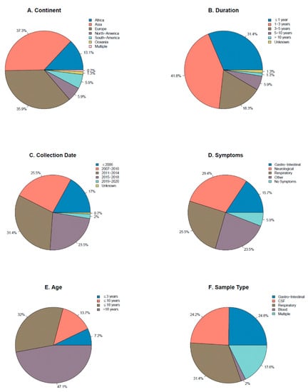 - Cordey, S.; Schibler, M.; L’Huillier, A.G.; Wagner, N.; Goncalves, A.R.; Ambrosioni, J.; Asner, S.; Turin, L.; Posfay-Barbe, K.M.; Kaiser, L. Comparative analysis of viral shedding in pediatric and adult subjects with central nervous system-associated enterovirus infections from 2013 to 2015 in Switzerland. J. Clin. Virol. 2017, 89, 22–29. [Google Scholar] [CrossRef]
