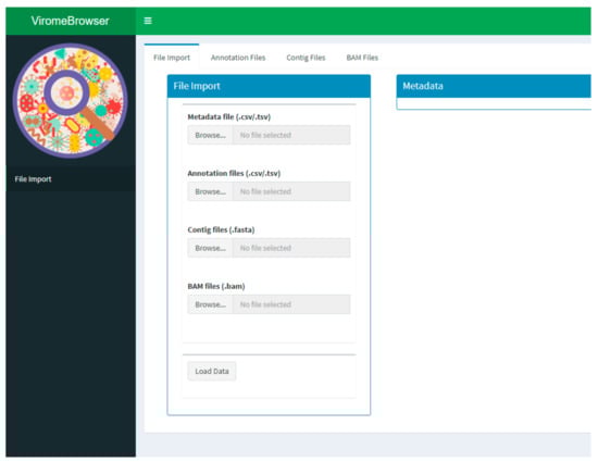The app is separated into three main parts, which are listed as separate menu items. The first part allows data to be loaded into the app by selecting a FASTA file containing contig sequences, a contig annotation file, a binary alignment (BAM) file containing mapped reads to contigs, and a metadata file (Figure 1). These files need to be in the format specified in the packages vignette. Briefly, the contigs have to be in regular FASTA format with the FASTA headers exactly matching the contig identifiers in the annotation and read mapping files, the contig annotation files need to be in BLAST tab-separated format, the read mapping files need to contain the mapped reads to the aforementioned contigs, and the metadata file needs to be in tab-separated format in which the file names are in the first column and the sample characteristics are listed in each additional column. Currently, only default tabular BLAST-like output is supported, but other tabular formats can be implemented by creating a novel import function. To determine the taxonomic lineage of each annotation based on the associated taxonomic identifier, the application uses the “rankedlineage.dmp” file, which is downloaded automatically from the NCBI taxdump database at ftp.ncbi.nlm.nih.gov/pub/taxonomy/new_taxdump/ (accessed on 8 March 2021). For contigs with multiple associated annotations, which is not unusual for BLAST output, a lowest common ancestor (LCA) taxonomic lineage is determined by finding the lowest order taxon that is present in all annotations. If no LCA can be found, the contig is annotated as “root”. The LCA calculation is performed after annotation quality filtering to avoid spurious hits from interfering in the process.