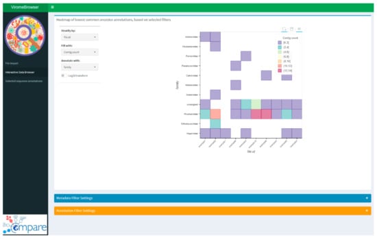 The use of metagenomic sequencing to explore the virome of complex samples such as stool, sewage, and environmental samples has increased over the years [1]. Alongside the increase in virome studies, a plethora of viral metagenomics processing workflows have been created [2]. The results of experiments in which complex virome sequencing data are generated are difficult to visualize and unpack for a person without programming experience. After processing of the raw sequencing data by next-generation sequencing (NGS) processing workflows, the usual output consists of contiguous sequences (contigs) in FASTA format and an annotation file linking the contigs to a reference sequence or taxonomic identifier in tabular format [3,4,5,6]. For example, Virusfinder outputs several text files containing annotations and contig sequences as results [3], and VirFind outputs tabular annotation and FASTA files for viral and non-viral annotations [5]. Further unpacking of results and getting an overview of which viruses are found in which samples is especially difficult when these data are spread over multiple tables containing many annotations. Many of the workflows generate a summary file and figures containing a selection of the annotated sequences from the sample based on predefined selection criteria. For example, SURPI generates a summary annotation file specifying read counts and contig coverage but relies on Excel for annotation summarizing and comparison [4]. Interestingly, virus identification pipeline (VIP) produces an html report that can be browsed interactively for individual samples and viruses but does not allow for comparison of samples [6]. A first and routine step in virome analysis is an annotation quality check. If quality thresholds are set upfront in the sequence annotation workflow, depending on the virus and the intentions of the user, these settings can be too stringent or too relaxed, resulting in either false negatives or false positives [7,8,9]. Therefore, manual inspection and manual filtering using custom quality criteria are often needed, which means that the workflow has to be rerun with different settings or, if possible, the unfiltered annotation results can be filtered using custom scripts and further analyzed using visualization tools.