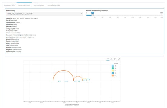 Users can continue to zoom in on a single contig in the app by selecting one or more contigs from the table and continuing to the contig information tab (Figure 3). In this tab, a single contig is displayed for which open reading frames (ORF) are predicted by performing a canonical stop codon lookup and using these to split each frame into ORF fragments. The ORFs are represented by arcs on the contig and are predicted for all six frames, and small spurious ORFs can be filtered by setting a minimal ORF size. The visualization allows users to perform a quick check of the expected ORF structure of an annotated virus. Individual ORFs can be viewed under the ORF information tab, and nucleotide or amino acid sequences can be directly selected and copied. Alternatively, all displayed ORFs can be collected in the ORF collection table and saved in FASTA format. For further analysis, it is sometimes useful to only extract certain ORFs from a genome, which is possible by separately saving ORFs in FASTA format.
