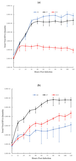 Virus growth kinetics of (a) EV71:TLLβP20 and (b) its parental wild-type ST strain by total viral RNA quantity in the culture supernatant of infected Vero cells incubated at 28 °C (blue line), 37 °C (black line) and 39.5 °C (red line).