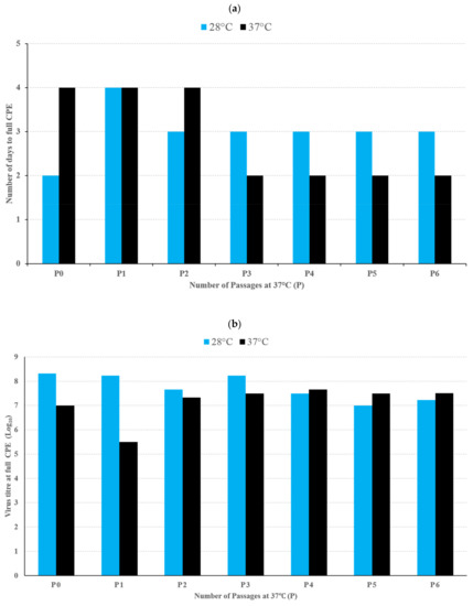 Assessment of temperature reversion growth characteristics of EV71:TLLβP20 following 6 successive passages in Vero cells incubated at 37 °C. Growth characteristics of the virus derived from each successive culture at 37 °C in terms of (a) virus growth kinetics by cell death and (b) virus titre in CCID50/mL at full cytopathic effect (CPE) at incubation temperature of 28 °C (blue bar) and 37 °C (black bar).