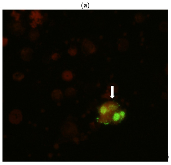 Virus isolation was performed on monkeys’ sera, peripheral blood mononuclear cells (PBMC), stool samples and all autopsied tissues using Vero cells incubated at 28 °C and 37 °C. No virus was isolated from any of the monkeys’ samples despite a blind passage after 10 days culture. One additional blind passage in Vero cells was performed for sera, PBMC samples and those tissue homogenates that were tested positive for EV-A71 by RT-PCR. Despite failing to reisolate the virus, the EV-A71 antigen was detected by IFA in a few PBMCs derived from heparinized blood of two monkeys, 2891F (received 1 × 107 CCID50 of EV71:TLLβP20) and 2890M (received 1 × 108 CCID50 of EV71:TLLβP20), collected on day 4 PI (Figure 3a). No virus antigen was detected in PBMCs harvested from heparinized blood of monkeys collected on day 8 PI.