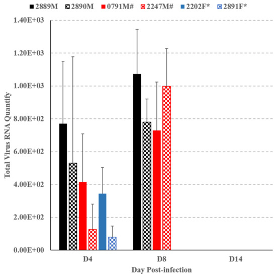 Total viral RNA quantity in the serum samples of monkeys collected on day 4, day 8 and day 14 postinfection was assayed by quantitative RT-PCR. Two of the monkeys were sacrificed on day 4 (2202F*, 2891F*) and two additional monkeys on day 8 (0791#, 2247#). No viral RNA was detected in the serum samples collected on day 14 of two remaining monkeys (2889M, 2890M).