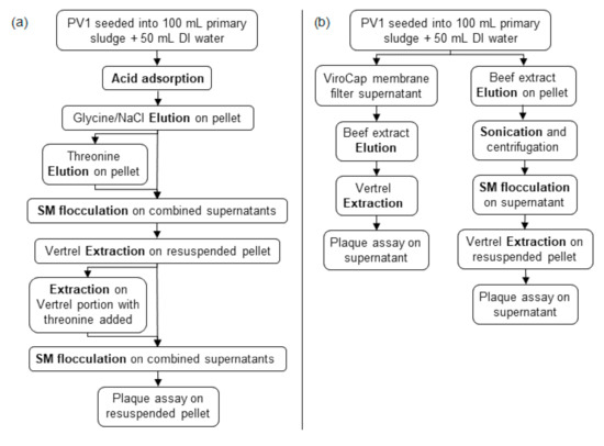 (a) Method 1 and (b) Method 2 experimental designs for preliminary investigations. PV1 is poliovirus type 1. DI is deionized. SM is skimmed milk flocculation.