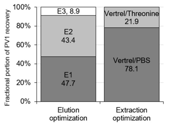 Extraction optimization showed the fractional contribution of the Vertrel/PBS and Vertrel/threonine extractions on the total PV1 recovery (Figure 2). Vertrel/PBS extraction resulted in significantly greater PV1 recovery (37.9 ± 15.5%, 95% CI) compared to re-extraction in Vertrel/threonine (10.3 ± 4.5%, 95% CI) (n = 7, p = 0.004; Figure 4). The total mean combined recovery for these extractions was 48.2 ± 19.6% (95% CI, n = 7), resulting in significantly greater total PV1 recovery when compared to the preliminary M1 protocol (p = 0.038).
