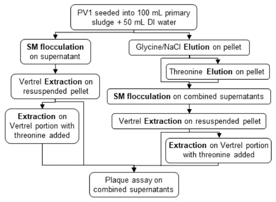 Based on the methods tested and optimizations completed, enteric virus recovery from primary sludge can be maximized through a relatively simple method with the exclusion of an acid adsorption step and by processing the solid and liquid fractions separately (Figure 6). After collection, samples should be kept at 4 °C, and processing should begin within 24 h. The solids should be eluted twice, secondary concentrated using skimmed-milk flocculation, and extracted with Vertrel/PBS and Vertrel/threonine. The liquid fraction should be concentrated by skimmed-milk flocculation, and extracted with Vertrel/PBS and Vertrel/threonine. The solids and liquids concentrates can be combined at this step and assayed or assayed separately. This would yield a 66.6% percent recovery (Figure 5), with a limit of detection 113 PFU/sample (1.13 PFU/mL).