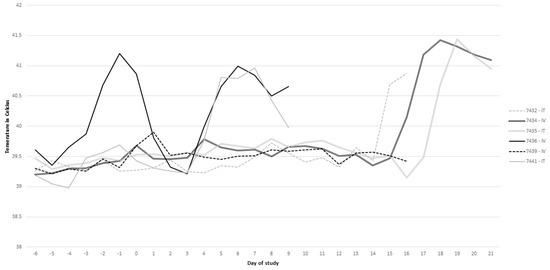 - Falkenberg, S.; Ridpath, J.; Ley, B.V.; Bauermann, F.; Sanchez, N.B.; Carroll, J. Comparison of temperature fluctuations at multiple anatomical locations in cattle during exposure to bovine viral diarrhea virus. Livest. Sci. 2014, 164, 159–167. [Google Scholar] [CrossRef]
