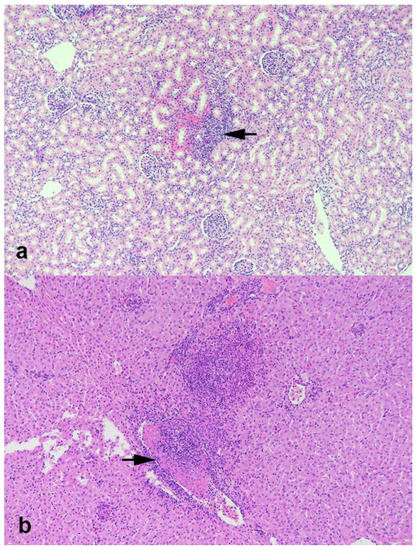 Photomicrographs of kidney (a) and liver (b) from calves experimentally inoculated with SARS-CoV-2. (a) Focal area of hemorrhage and infiltrates of lymphocytes and lesser numbers of neutrophils (arrow). (b) Multifocal area of necrosis with infiltrates of mixed inflammatory cells (neutrophils, macrophages, lymphocytes). Note vasculitis with fibrinocellular thrombus (arrow). Hematoxylin and eosin (HE). Magnification = 10×.
