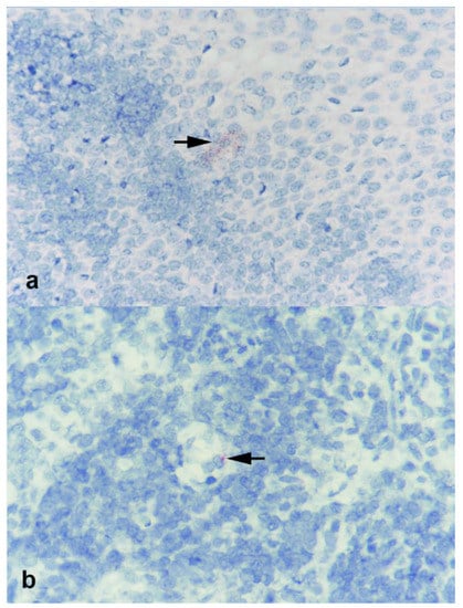 Photomicrographs of (a) palatine tonsil and (b) tracheobronchial lymph nodes from calf 7441 experimentally inoculated with SARS-CoV-2 and examined 9 days later. Sparse labeling for viral RNA is noted at base of stratified squamous epithelial layer in tonsil and in lymphoid follicle of lymph node (arrows). RNAscope ISH SARS-CoV-2. Magnification = 40×.