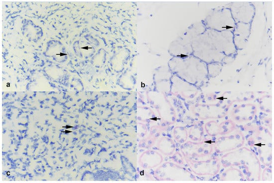 Photomicrographs of (a) turbinate, (b) palatine tonsil, (c) lung, and (d) kidney from calves experimentally inoculated with SARS-CoV-2 and examined 9 days later. In both turbinate and tonsil, sparse labeling for ACE2 receptor is seen, associated with submucosal glands (arrows). Sparse labeling is also noted in lung (arrows) and within renal tubular epithelial cells in the kidney (arrows). BaseScope ISH ACE2. Magnification = 40X.