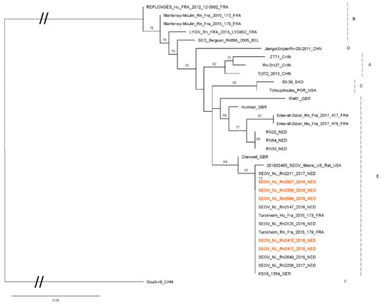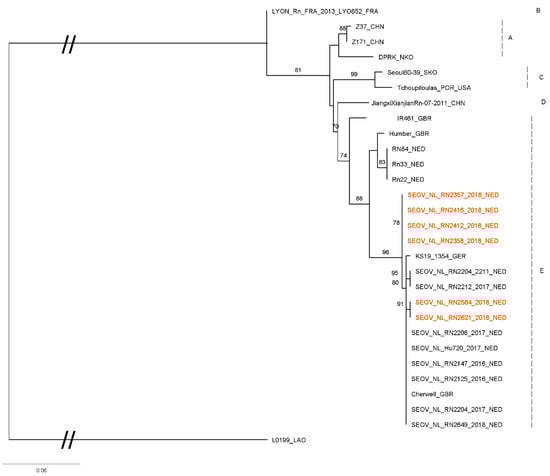 Maximum likelihood phylogenetic tree for SEOV partial S segment (274nt) sequences. Sequences from this study are shown in red (Genbank accession numbers MT993920-MT993924). The quality of the sequences from the two positive rattery rats was too low to include in this comparison. Numbers along branches are bootstrap values, only bootstrap support of >70% are shown. Scale bar indicates nucleotide substitutions per site. Letters behind branches refer to groups of SEOV sequences as described by Kim et al. []. At the end of the strain names the country of origin is given: BEL, Belgium; CHN, China; FRA, France; GBR, Great Britain; GER, Germany; SKO, South Korea; NED, The Netherlands; and USA, United States.