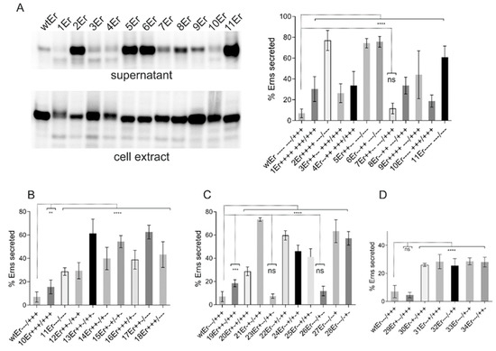 The amphipathic helix of Erns is not only important for processing at the Erns/E1 site but is also crucial for Erns membrane anchoring and intracellular retention of the protein [3,25,27,28,37,48]. Mutations disturbing the amphipathic character of the carboxy-terminal helix lead to significantly increased secretion of Erns [27]. So far, the importance of the conserved charged residues in the amphipathic helix for the retention/secretion equilibrium is not known. Therefore, we introduced a selected set of the above-described mutations into an Erns expression construct and compared the secretion level with that of wt Erns. We started with mutants equivalent to those analyzed in Figure 2 with up to seven exchanges in the set of the seven negatively charged residues upstream of the mirror axis and the three arginines downstream thereof. Except for mutant 7Er with exchanges affecting the first two negatively-charged residues, all of the tested mutants showed significantly increased Erns secretion, even though the extent of this increase was somewhat variable (Figure 5A). As already observed when analyzing Erns-E1 processing, exchanges affecting only the inner six residues had similar effects as mutations including replacement of the four upstream negatively charged amino acids. We, therefore, again concentrated on the inner six charged residues during further analysis. Except for the mutation D177R (mutant 29E+ − −/+ + +), all exchanges of single amino acids with opposite charge had significant effects on Erns secretion with at least doubling the amount of extracellular Erns (Figure 5B). Replacement of up to six of these residues by amino acids with opposite charge had variable effects with some mutants exhibiting about wt level or moderately increased secretion rates, whereas strong increases up to ~75% of Erns in the supernatant were detected for others (Figure 5B–D). An interesting observation already made when analyzing Erns-E1 processing was the in general higher effect of mutations affecting the arginines downstream of the mirror axis. Apart from the frequent presence of the R194E mutation in highly secreted mutants (see below), a common pattern correlated with high secretion levels was not obvious. As also seen for the processing step, a general tendency towards higher secretion rates was observed when more than one charge was changed, but the introduction of more than two alterations did not automatically lead to higher secretion rates than two changes.