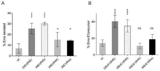 Arg194 alone has a significant impact for Erns secretion and Erns-E1 processing. Summary of the results of immunoprecipitation experiments with supernatant and extract of cells transiently expressing Erns or Erns-E1 or mutants thereof affecting Arg194. The numbers and mutations of the expressed constructs are given at the X-axis. The bars show the mean values of phosphorimager analyses based on at least three independent experiments for Erns secretion (A) and Erns-E1 processing (B) with standard deviation. Significant differences with regard to the wild type are indicated with asterisks. Er36 * p = 0.014, Er43 **** p = 0.0119. ns = not significant.