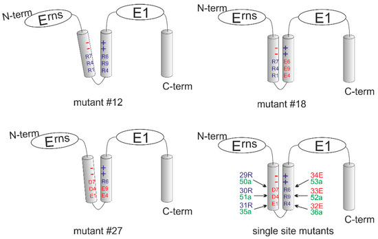 Most of the mutations described above had significant influence on Erns-E1 processing, but it has to be kept in mind that the introduced changes with the opposite charge were fundamental. The least invasive alteration that could be introduced into the amphipathic helix would be the replacement of charged residues by different amino acids with the same charge (e.g., exchange K for R or E for D). If charge mattered, these changes should be neutral, whereas the exchange of any negatively charged amino acid for any positively charged residue or vice versa should lead to an equivalent impairment of processing. We, therefore, tested a selected group of mutants reflecting the above-described two groups with preservation of the same charge or replacement by both possible residues with opposite charges. Constructs with charge preservation exchanges behaved similar to the wt, which result could be expected, since such exchanges also occur naturally in different virus strains (see Figure 3A). In contrast, introduction of the opposite charge had principally the same effect, regardless, which of the two possible amino acids were chosen (data not shown). Thus, it can be concluded that the effects of the mutations on processing resulted primarily from a change of charge and not from replacement of a specific amino acid.