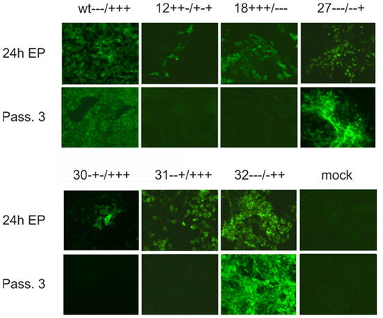 Taken together, our mutagenesis analyses prove that the conserved charged residues in the Erns membrane anchor have an influence on Erns-E1 processing and intracellular retention of Erns, but are not of crucial importance per se. Loss of single charged amino acids has only minor or moderate effects and even mutation of several charged residues does not block Erns-E1 processing completely. The maximal effect on Erns secretion rate in consequence of multiple exchanges was in the same range as observed for insertions impairing the amphipathic character of the Erns carboxy-terminus [27] or carboxy-terminal deletions of the E1 moiety in the Erns-E1 precursor [38]. The general level of the observed effects on processing and retention, and especially its dependence on the position of the alteration in the amphipathic helix do not support an obvious general importance of the conserved charge distribution. We, therefore, introduced a selected set of our mutations into the full-length cDNA copy of the CSFV Alfort/Tübingen genome [45], and tried to recover infectious viruses upon transfection of in vitro transcribed genome-like RNA. We selected mutants with moderate effect on secretion, and only low change of processing rate (e.g., mutant 18+ + +/− − − with exchanges D7R/D4R/E1R/R4E/R9E/R6E, mutant 12+ + −/+ − + with exchanges D7R/D4R/R9E and construct 31− − +/+ + + with E1R), moderate influence on both secretion and processing (e.g., mutant 32− − −/ − + + = R4E) and strong alteration of both parameters (e.g., mutant 27− − −/− − + with R4E/R9E). In addition, we also tested some single alanine mutations that had mostly shown no significant influence on Erns-E1 processing. Table 2 presents the complete list of the tested constructs and Figure 8 shows the influence of the changes with regard to the putative charge zipper. Transfection of RNA derived from the full-length plasmids resulted in detection of viral protein in the transfected cells when tested ca. 24 h post electroporation (representative examples shown in Figure 9). This finding proved replication of the transfected RNA since protein translated from input RNA is not detectable in our system as shown before [45]. Thus, the respective RNAs were at least functional as replicons. As a next step, freeze/thaw extracts of the transfected cells were generated and used for infection of fresh cells. This step was repeated three times and after three passages, the cells were tested by indirect immunofluorescence for expression of viral proteins. Positive results were obtained for the RNAs with the wt sequence and the mutants with only single exchanges except for mutants 30− + −/+ + + (D4R) and 31− − +/+ + + (E1R). Among mutants with more than one replaced amino acids only the double mutant 27− − −/− − + (R4E/R9E) allowed recovery of infectious viruses, whereas the other mutants and the mock control were negative (Table 2).