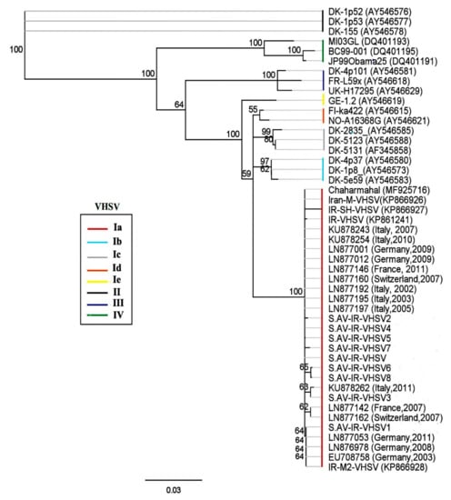 - Ghorani, M.; Adel, M.; Dadar, M.; Langeroudi, A.G.; Kamyabi, R.; Vakharia, V.N.; Einer-Jensen, K. Phylogenetic analysis of the glycoprotein gene of viral hemorrhagic septicemia virus from Iranian trout farms points towards a common European origin. Vet. Microbiol. 2016, 186, 97–101. [Google Scholar] [CrossRef] [PubMed]