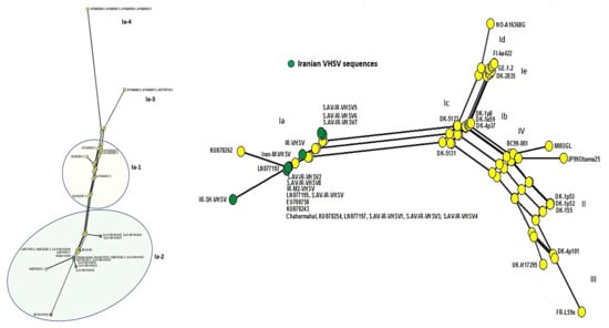 Neighbor network of non-homologous amino acids of VHSV glycoprotein fragment (513 bp). Left panel genotype Ia sequences only. Right panel all genotype sequences as indicated in Figure 2. Green circles indicate Iranian sequences.