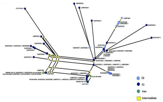 Phylogenetic analysis revealed that all the Iranian IHNV isolates belong to the European genogroup (E), with a bootstrap value of 96 (Figure 4). Moreover, S.AV-IR-IHNV1 (MK279324) and S.AV-IR-IHNV3 (MT431656) clustered together with previously described Iranian isolates, as well as published sequences from Germany (LN897533 and LN897560), and Italy (KU878359), supported by an inner clade bootstrap value of 59. Again, a haplotype analysis based on non-homologous amino acids of G was performed, and the resulting network indicated two lineages of IHNV originating from clade 1 (E-1) of the European genogroup (Figure 5).