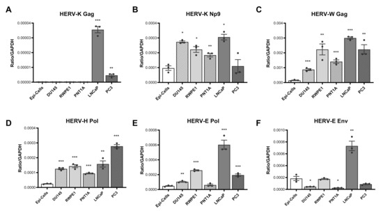 3.1. Expression of HERV Transcripts Is Significantly Upregulated in Prostate Cancer Cell Lines as Compared to Normal Epithelial Cells