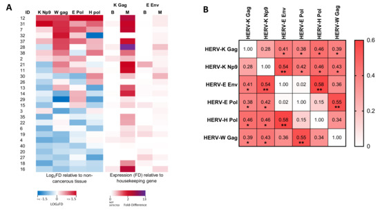 Associations between expression of various HERV transcripts in prostate cancer tissue. (A) Heat map showing the differential expression (log2 fold difference; FD) of HERV RNA transcripts in prostate cancer tissues from men with prostate cancer. Left panels show expression of HERV-K Np9, HERV-W Gag, HERV-E Pol and HERV-H Pol in malignant regions relative to benign regions of the prostate (each standardised to GAPDH). Right panels show expression of HERV-K Gag and HERV-E Env in both benign (B) and malignant (M) regions relative to expression of GAPDH (due to transcripts being undetectable in many benign tissue samples). (B) Correlation matrix showing the association between expression levels of the various HERV transcripts as determined by non-parametric Spearman’s correlation. For HERV-K Gag and HERV-E Env, the expression level in malignant tissues (relative to GAPDH) was analysed, whilst for all other transcripts, the expression in malignant tissue relative to benign tissue (both standardised to GAPDH) was used. Values show Spearman’s rho. * and ** indicate p < 0.05 and 0.01, respectively.