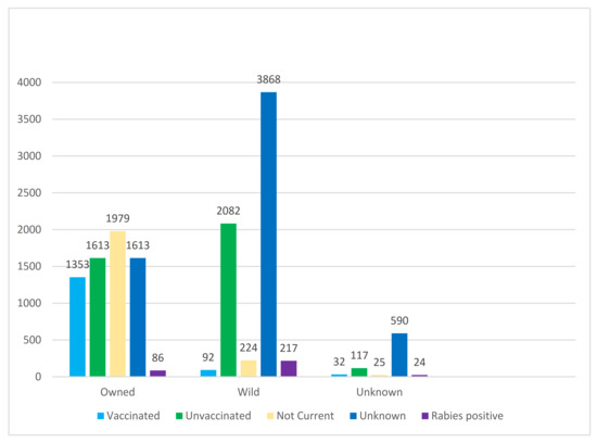 Of the 13,915 cats with a vaccination status available, 314 (2.3%) tested positive for rabies, of which 273 (87%) had bitten or scratched a human and 87 (28%) had bitten another domestic animal. Of the positive cats, 206 (66%) were reported as wild and either had an unknown, unvaccinated, or not-current vaccination status (Figure 2).