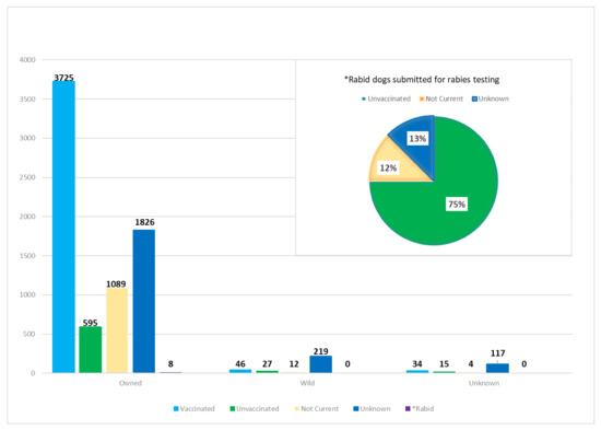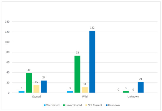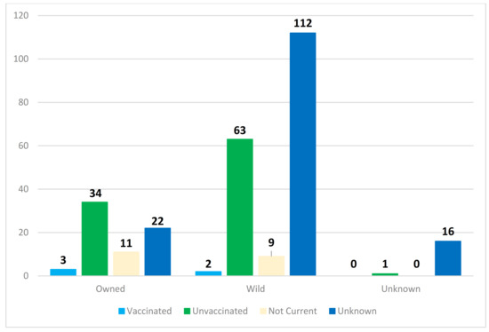 Considerably fewer dogs (with a complete specimen history) were submitted during the same time period, totaling 7717 (10%) of all specimen samples. More than 94% (7243) of the dogs were reported as owned, which is substantially more than in the cat submissions. Of the submitted total, 304 (4%) were reported as wild and 3805 of all dogs submitted for testing were currently vaccinated (Figure 5). In fact, dogs were 61% more likely than cats to be vaccinated regardless of their ownership status. Between 2008–2020, eight dogs tested positive for rabies at the New York State Wadsworth Center Rabies Laboratory. All eight were reported as owned; six were unvaccinated, one was allegedly not current, and one had an unknown vaccination history. All eight had bitten or scratched a human. Four of the eight reportedly exposed another domestic animal, and the other half had an unknown history of domestic animal exposure.