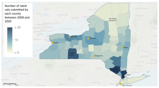 In this study, an Access search was performed to gather data on all cats and dogs from New York State submitted between January 1, 2008 and December 31, 2020. Specimens submitted directly to the New York City Laboratory were not included in this study. The query differentiated for the following: wild vs. owned animals, geographical location (latitude and longitude), vaccination history (current, not current, unvaccinated, unknown, or not answered), exposure status (bite, scratch, or contact with another human or domestic animal), direct fluorescent antibody (DFA) results (negative, positive, or indeterminate), and the antigenic viral variant of infection. The geographical information system (ArcGIS) was used to compile specimen demographics with New York State Civil boundary files, obtained through public records (ESRI, Redlands, California, USA).
