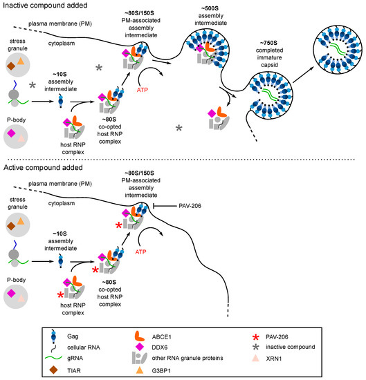 - Dooher, J.E.; Schneider, B.L.; Reed, J.C.; Lingappa, J.R. Host ABCE1 is at Plasma Membrane HIV Assembly Sites and Its Dissociation from Gag is Linked to Subsequent Events of Virus Production. Traffic 2007, 8, 195–211. [Google Scholar] [CrossRef] [PubMed]