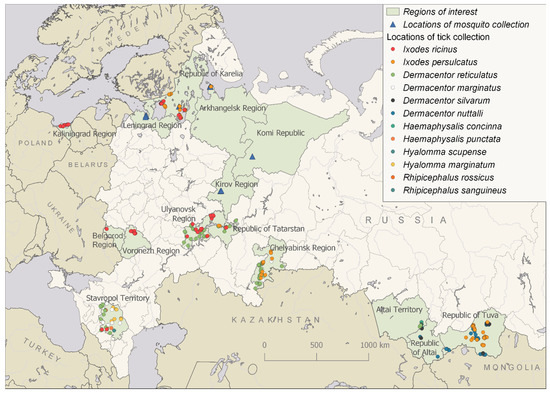 We collected ticks in different regions of Russia during the period 2011–2019 (Figure 1 and Figure 2 and Table S2). A total of 7122 ticks of 12 species were collected and analysed: I. ricinus, Ixodes persulcatus, Dermacentor reticulatus, Dermacentor marginatus, Dermacentor silvarum, D. nuttalli, Hyalomma marginatum, Hyalomma scupense, Haemaphysalis concinna, Haemaphysalis punctata, Rhipicephalus rossicus and Rhipicephalus sanguineus.