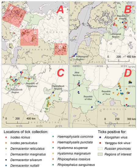 Locations of the Alongshan virus and Yanggou tick virus detection in ticks collected from vegetation and animal hosts in different regions of Russia. (A) Location of sample areas shown in detail in maps B, C and D; (B–D) Locations where ticks were collected.