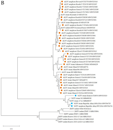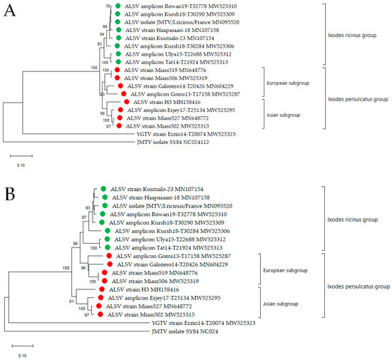 According to the phylogenetic analysis carried out both on genome fragments of segments 1 and 2 and on the complete amino acid sequences of the VP1a proteins (segment 2), ALSV can be divided into two clades: an I. persulcatus clade and an I. ricinus clade. However, the phylogenetic analysis of VP1b showed the presence of Asian and European clades, the latter of which was divided into the “I. ricinus” and “I. persulcatus” groups. Regardless of which gene or protein was used in the phylogenetic analysis, strains isolated from the areas of absolute dominance by I. persulcatus (with the absence of I. ricinus) or by I. ricinus (without the presence of I. persulcatus) formed separate groups. The I. persulcatus areas include the Republics of Tuva [41] and Altai [42], Altai Territory, Chelyabinsk Region [43] and China [44], whereas I. ricinus inhabits the Kaliningrad Region [45] and Europe, including France [46].