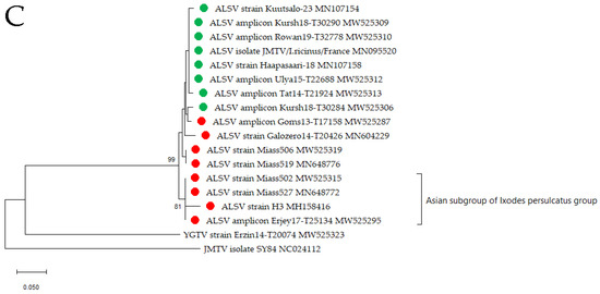The division of ALSV isolates into groups is not well-defined in the sympatric zone occupied by both I. ricinus and I. persulcatus ticks. It has been assumed that the zone of sympatry of these tick species runs through the territories of the Republic of Tatarstan, Ulyanovsk Region, the Republic of Karelia [47] and Finland [48]. However, ALSV was detected in an area inhabited only by I. ricinus ticks in Finland [13] and only by I. persulcatus in the Republic of Karelia [7,47]. Two Finnish strains detected in I. ricinus [13] belonged to the I. ricinus group. A slightly different situation was observed in the Republic of Karelia, where ten ALSV amplicons were detected in I. persulcatus ticks. Six amplicons and one isolated strain were found to belong to the I. persulcatus group and three amplicons: Goms13-T17182/2, Goms13-T17190/2 and Goms14-T20532 to the I. ricinus group. This may be due to the fact that short sequences were used in the phylogenetic analysis. However, if these three amplicons actually belong to the I. ricinus group, then this could have happened as a result of mammals or birds introducing the virus into the territory in which I. ricinus ticks have never before been detected. Additionally, we cannot exclude the possibility of ALSV belonging to the I. ricinus group infecting I. persulcatus ticks and vice versa, as shown by the example of TBEV in the sympatric zone [49,50]. In the Ulyanovsk Region, we detected two positive samples in I. ricinus and D. reticulatus ticks. The amplicon Ulya15-T22688 from I. ricinus belongs to the I. ricinus clade, but the amplicon Ulya14-T20695 from D. reticulatus belongs to the I. persulcatus clade, as well as positive samples from the Republic of Altai and Altai Territory that were detected in D. nuttalli and H. concinna, respectively. Since the territories of the Republic of Altai and Altai Territory are not only inhabited by I. persulcatus ticks, perhaps other tick species can also receive ALSV during cofeeding on an infected animal and are not specific vectors. Further study of the possible cofeeding transmission of ALSV is needed, as well as the study of the vector competence of the Dermacentor and Haemaphysalis tick species. We can observe the same pattern in TBEV when the distribution of the European subtype is associated with I. ricinus ticks and of the Siberian and Far Eastern subtypes with I. persulcatus ticks [51].