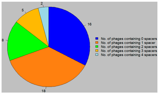 When spacers occurring in multiple strains are accounted for, there are 384 unique spacers across all nine P. larvae strains. The 384 spacers were searched for in the 49 sequenced P. larvae phage genomes using a Python script, resulting in the identification of 57 spacer sequences (i.e., protospacers) in the 49 phage genomes. The distribution of the phages by number of protospacers is shown in Figure 1. About a third of sequenced P. larvae phages do not contain any protospacers, about a third contain one protospacer, and about a third contain more than one protospacer; two P. larvae phages contain a maximum of four protospacer sequences.