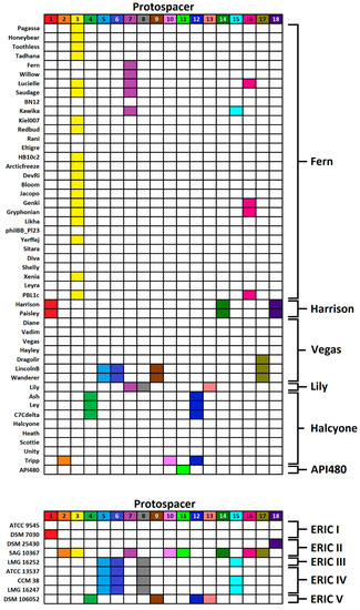 The current classification of sequenced P. larvae phages consists of four clusters and two singletons [22,25]. Clusters are named after a representative phage from each cluster. The largest cluster is the Fern cluster (30 members), followed by the Halcyone cluster (eight members), the Vegas (seven members), the Harrison cluster (two members), and two singletons, Lily and API480. The distribution of protospacers juxtaposed with the 49*49 ANI matrix is included as Supplemental Figure S1.