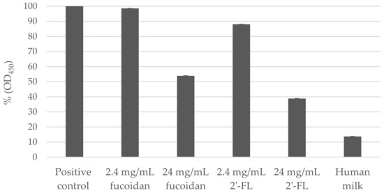 Percentage (%) of norovirus (NoV) GII.4 virus-like particles (VLPs) pre-incubated with fucoidan, 2′-Fucosyllactose (2′-FL) or human milk binding to type A saliva (OD450) in comparison to positive control (NoV GII.4 VLPs without carbohydrate blocking). Each column represents the average of triplicates, and each error bar indicates the standard deviations.