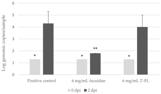 Next, we selected the highest possible concentration at 6.00 mg/mL to test the effect fucoidan and 2′-FL in parallel. During all four independent experiments performed in four different weeks, the groups of 6.00 mg/mL fucoidan were three times detected with below detection limit (<1.3-log genome copies/sample) and once slightly above (1.8-log genome copies/sample), and the groups of 6.00 mg/mL 2′-FL did not show any significant inhibition in comparison with the positive controls (p > 0.05) (Figure 2).